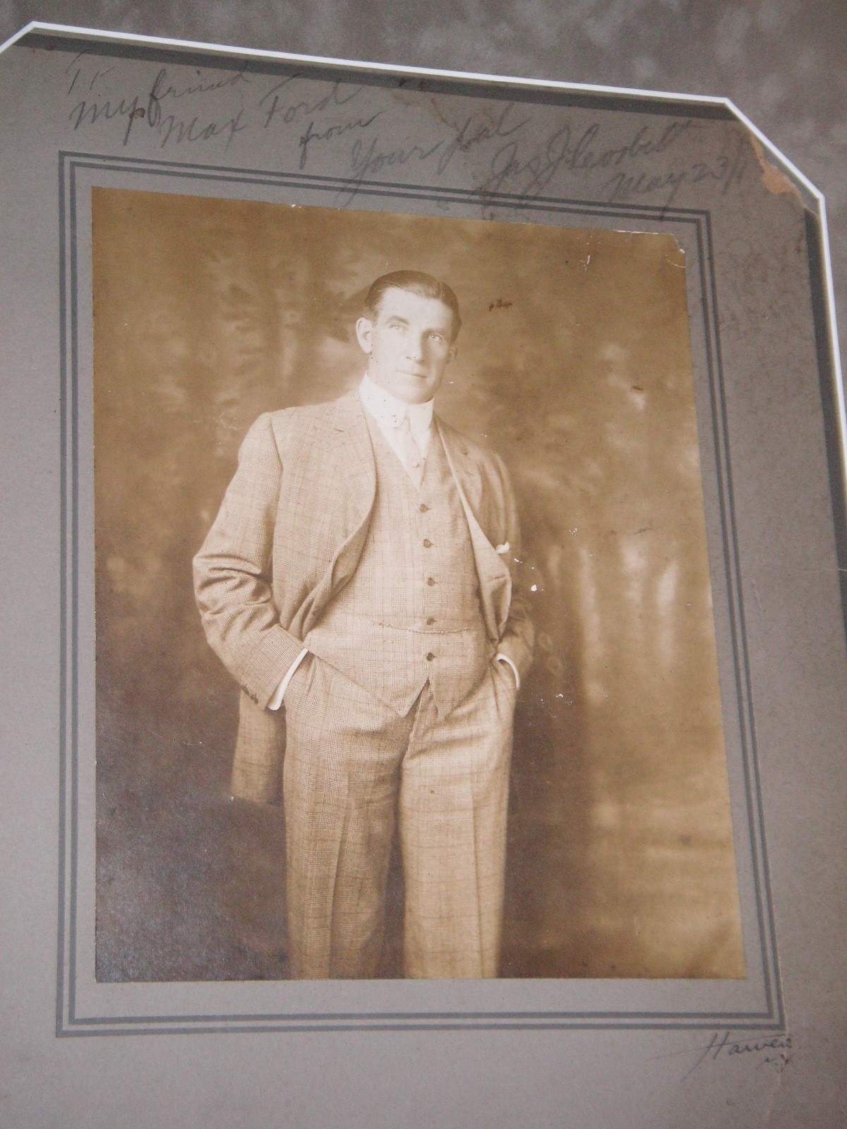 Tunney, 13” x 15”, $400.00. Next up was an unsigned photo of Dempsey in a suit and hat with a hand in his