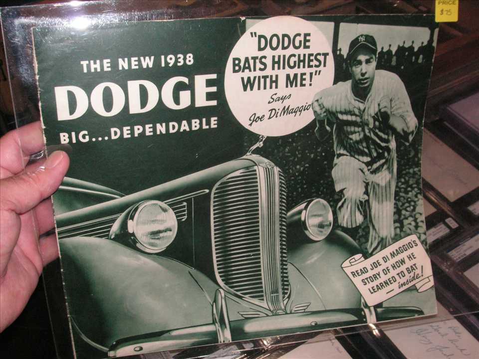 DiMaggioDodgeBklt.JPG (77372 bytes)Next up was a very neat 13" wide x 11" tall 1938 Dodge sales brochure featuring Joe DiMaggio running to base, with ad copy "DODGE BATS HIGHEST WITH ME" -Joe DiMaggio...coupled with "Read Joe DiMaggio's story of how he learned to bat - inside", all that for $75.00...should have gotten it, bargain of the show!