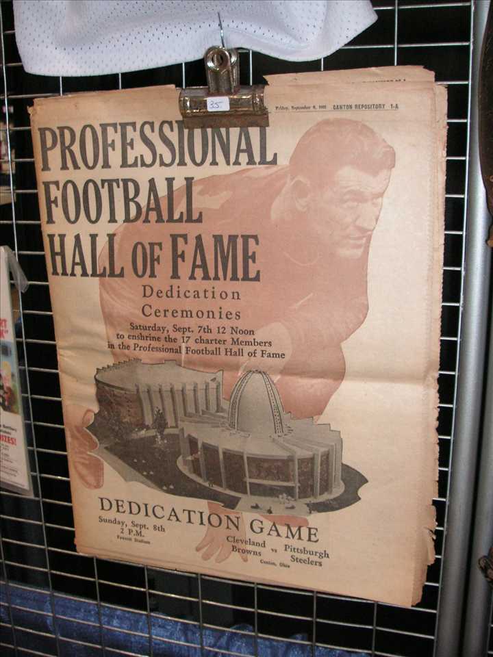 FBHOFCover.JPG (66803 bytes)Next was a  Sept 6, 1963 dedication ceremony  program for the Professional Football Hall of Fame. The cover featured a photo of the building and a huge superimposed overlay photo of Jim Thorpe. Was printed on newspaper stock and would have to be very rare, 15" tall x 12" wide, $35.00
