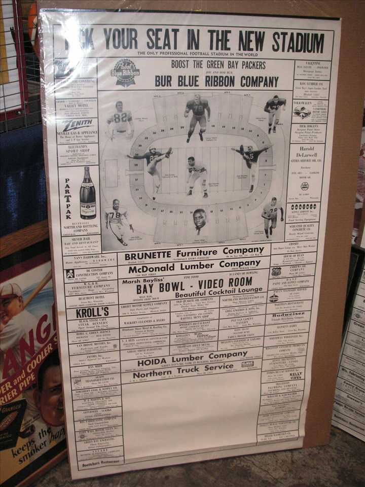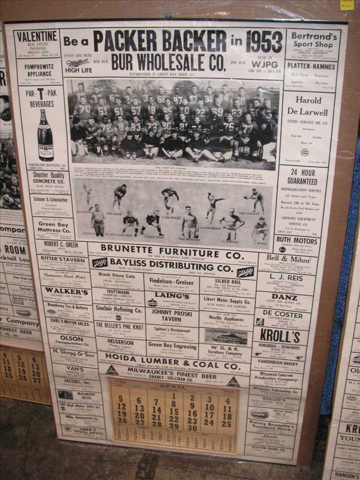 GreenBay4Posters.JPG (82256 bytes)Next up were four large 45" tall x 26 1/2" wide calendars promoting the green bay packers, one for 1953, 1956, 1961 missing calendar, and the other undated also missing the calendar, $500.00 each