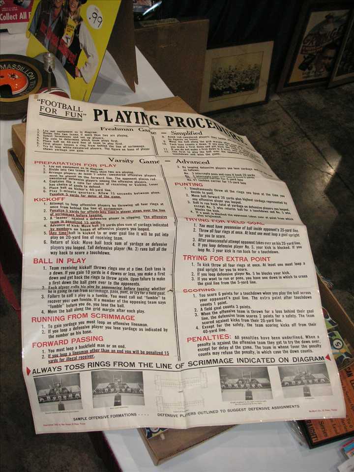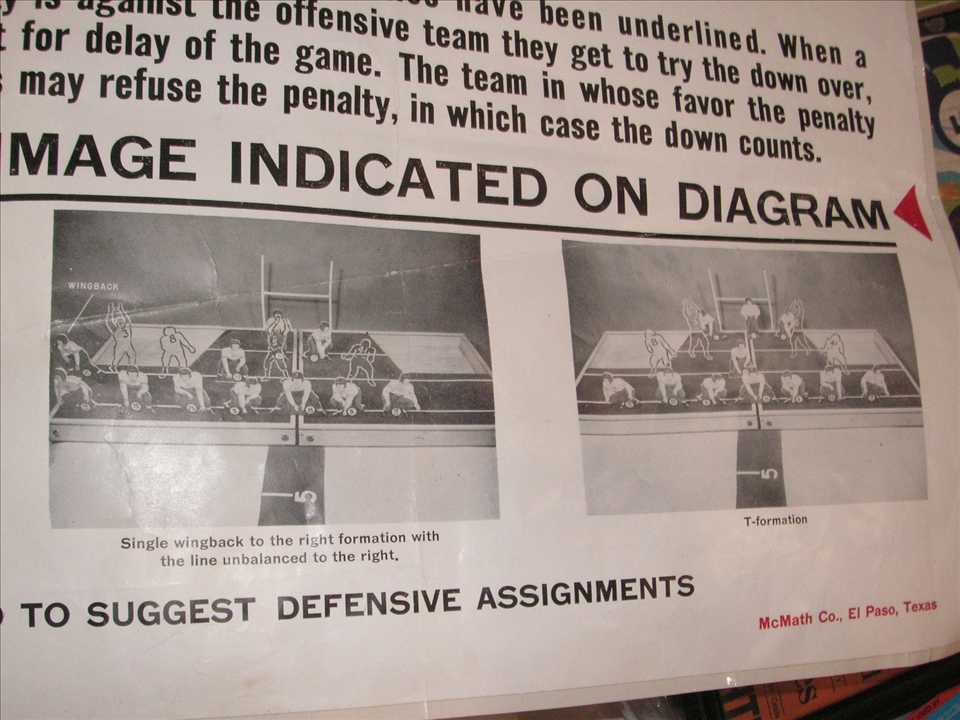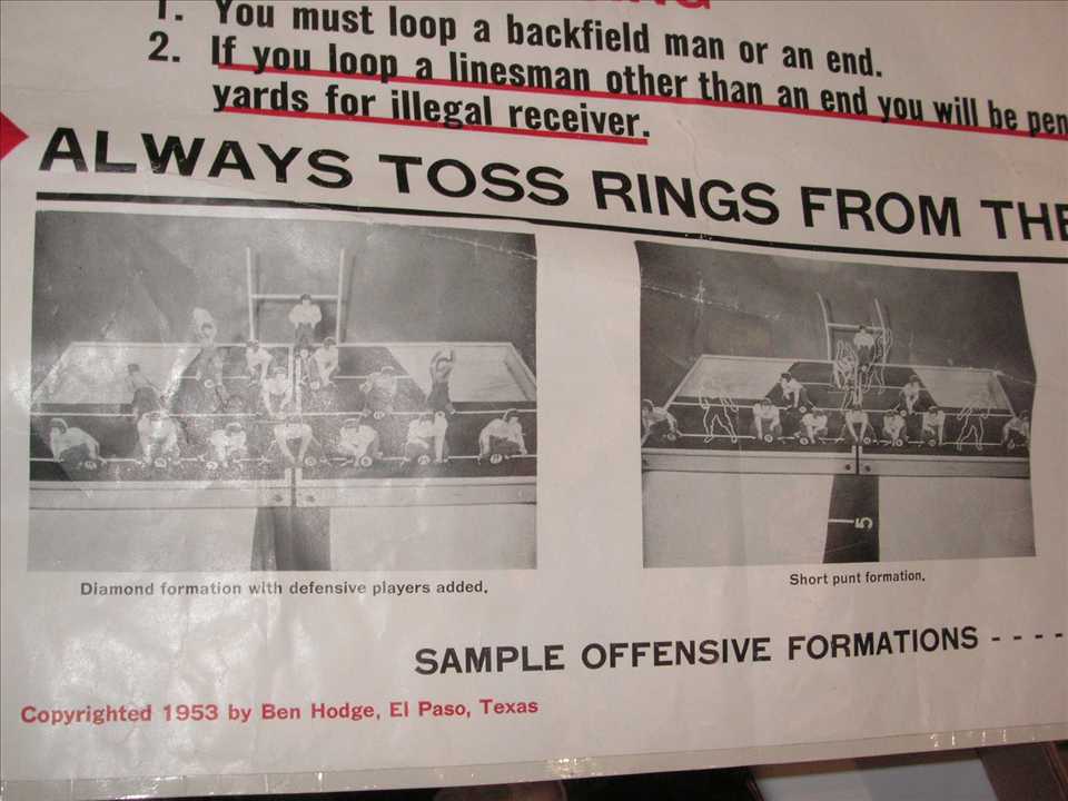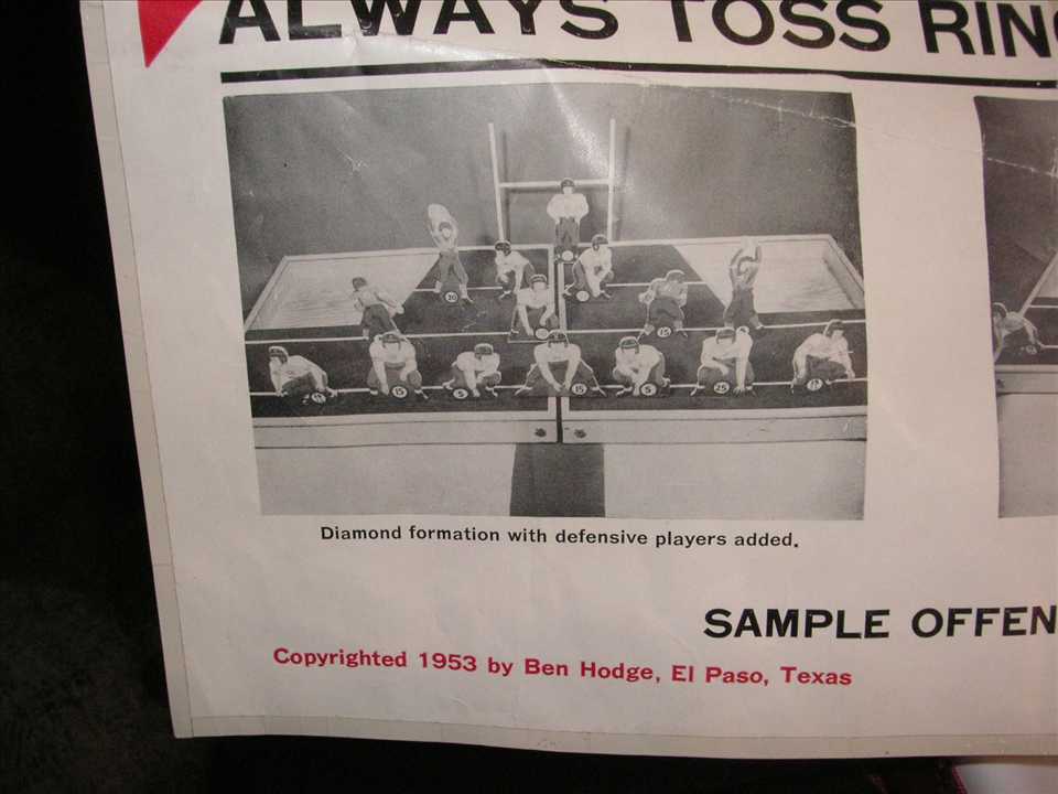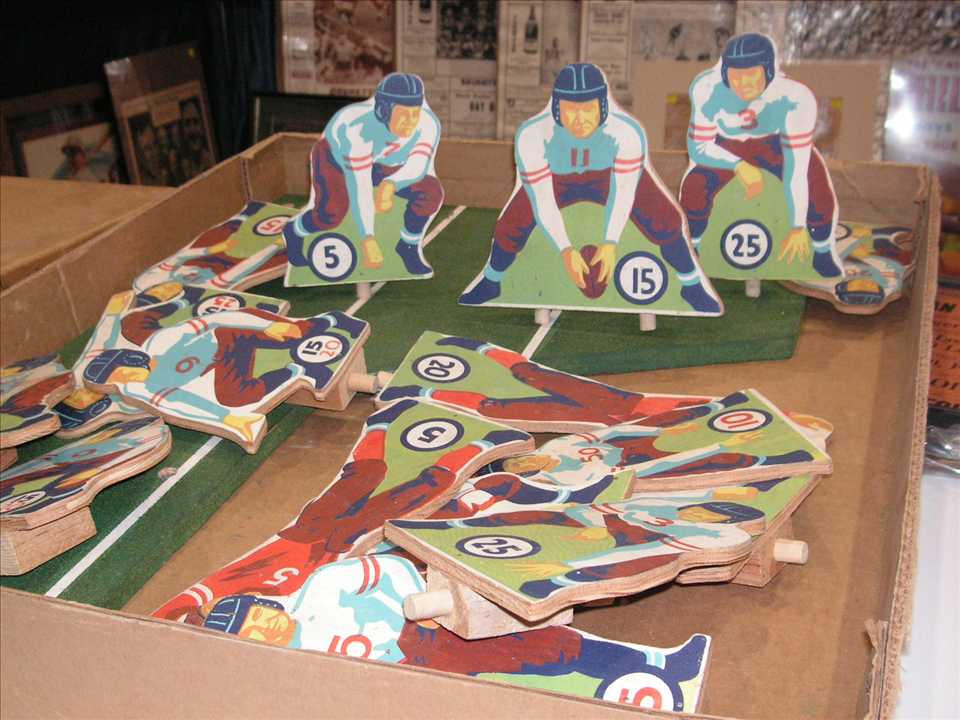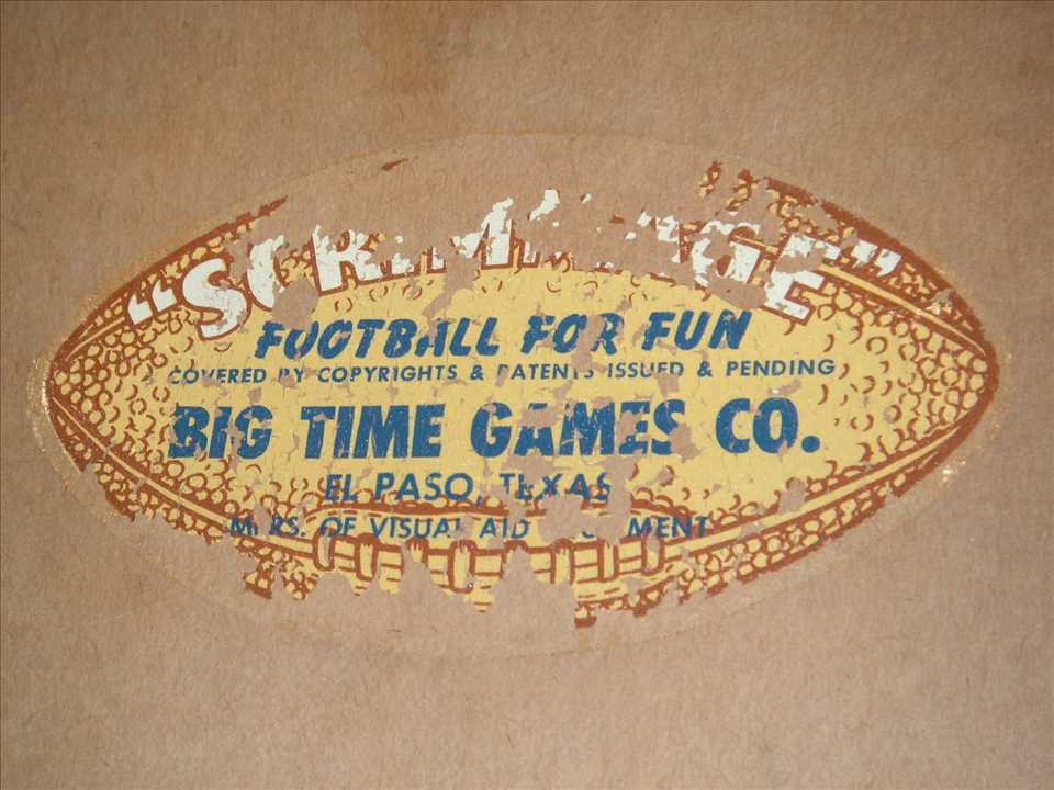 PiecesUpright.JPG (76583 bytes)Next up was a 1953 football table game called Scrimmage made by Big Times Game Company in El Paso Texas. Quite a rare game and big, only example I've seen, die cut players were 6" to 9" tall, box dimensions were 25" x 20 1/2", $600.00