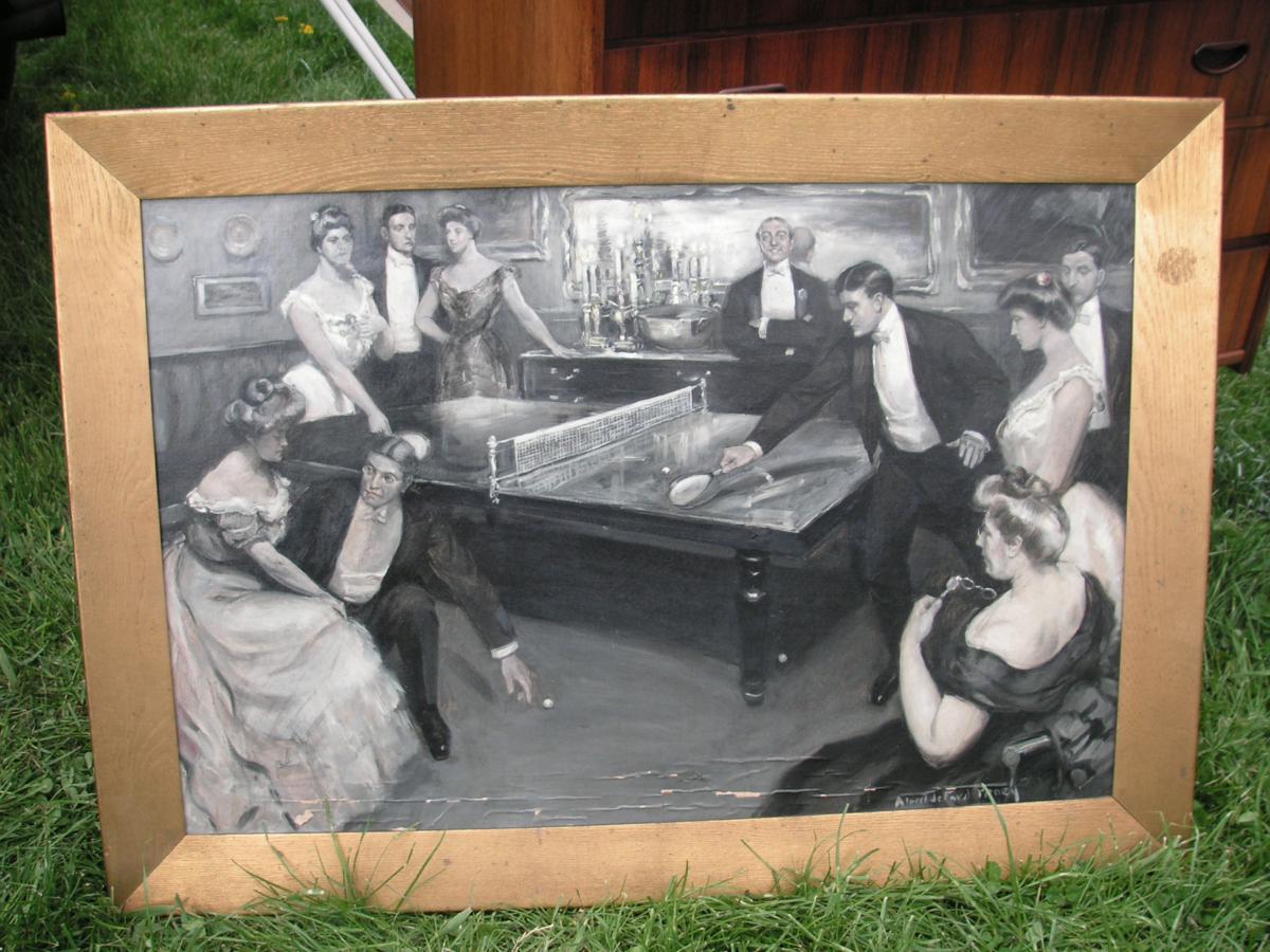 You can view the painting in our collecting magazine: http://www.ittf.com/museum/TTC62.pdf . Note that the article that followed was about yet another similar illustration of the time, which I happened to use for the cover of my 2012 book. A number of similar illustrations were seen in U.S., London, Paris and Italian magazines, books and newspapers, all in 1901-1902 when ping pong was a huge craze led by "high society." Naturally these are all well known to us serious collectors, from eBay, from our collecting magazine, and from the ITTF Museum website.
