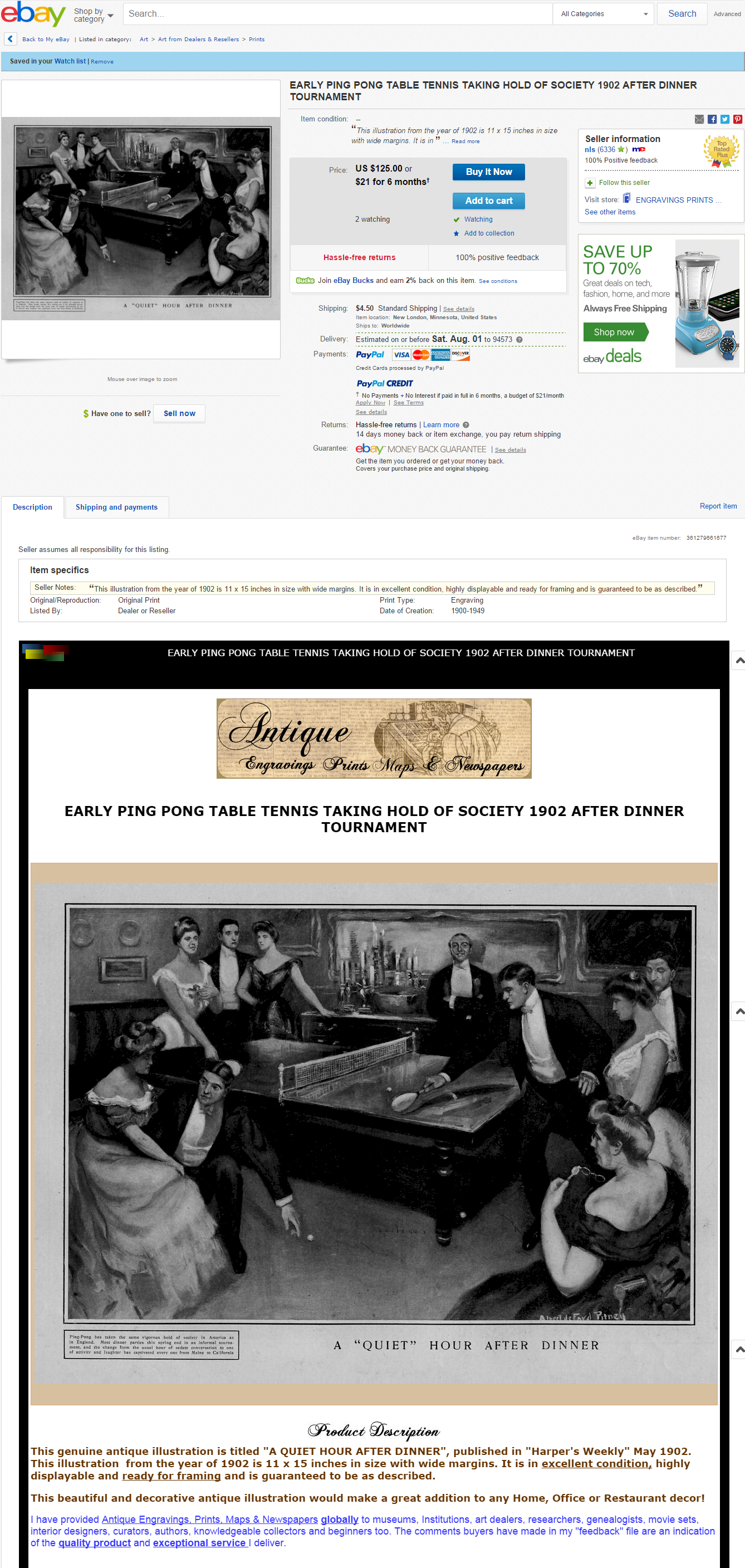 comments: Just came across your Antique of the Week from last August, the ping pong oil painting by Pitney. I bought this painting (not the print) on eBay in 2012 for about $2700. As a ping pong historian I recognized the image immediately, and there was heavy competition for it among fellow collectors on eBay. Quite interesting to see your photos and to learn it was once sitting on the grass at Brimfield! I am the author of Ping Pong Fever---the Madness That Swept 1902 America.I'm still wondering why the oil painting was created. I would think an illustrator would normally just make a pen and ink drawing. Do you have any thoughts on this? I can understand that the artist would like to make an extra profit by selling an oil painting. But then how was it converted into a magazine