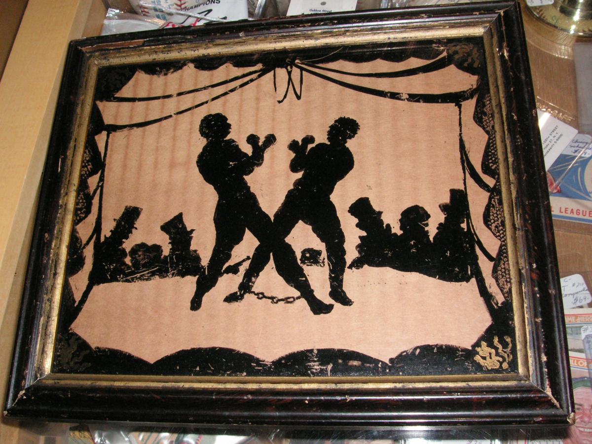 two 1880ish boxers one white, one black, and the puppet Punch of the