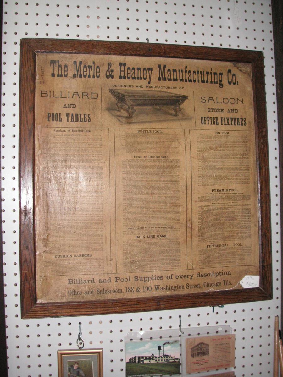billiard rules poster issued by The Merle & Heaney Manufacturing