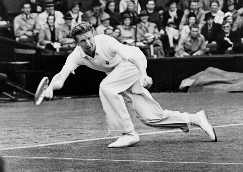 superimposed photo of Budge going for the ball seemingly in mid air takes up