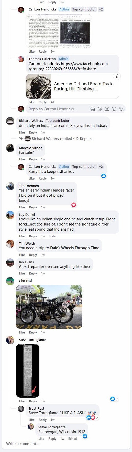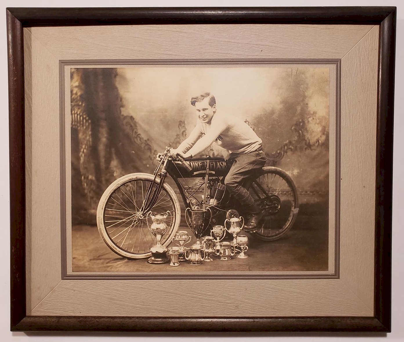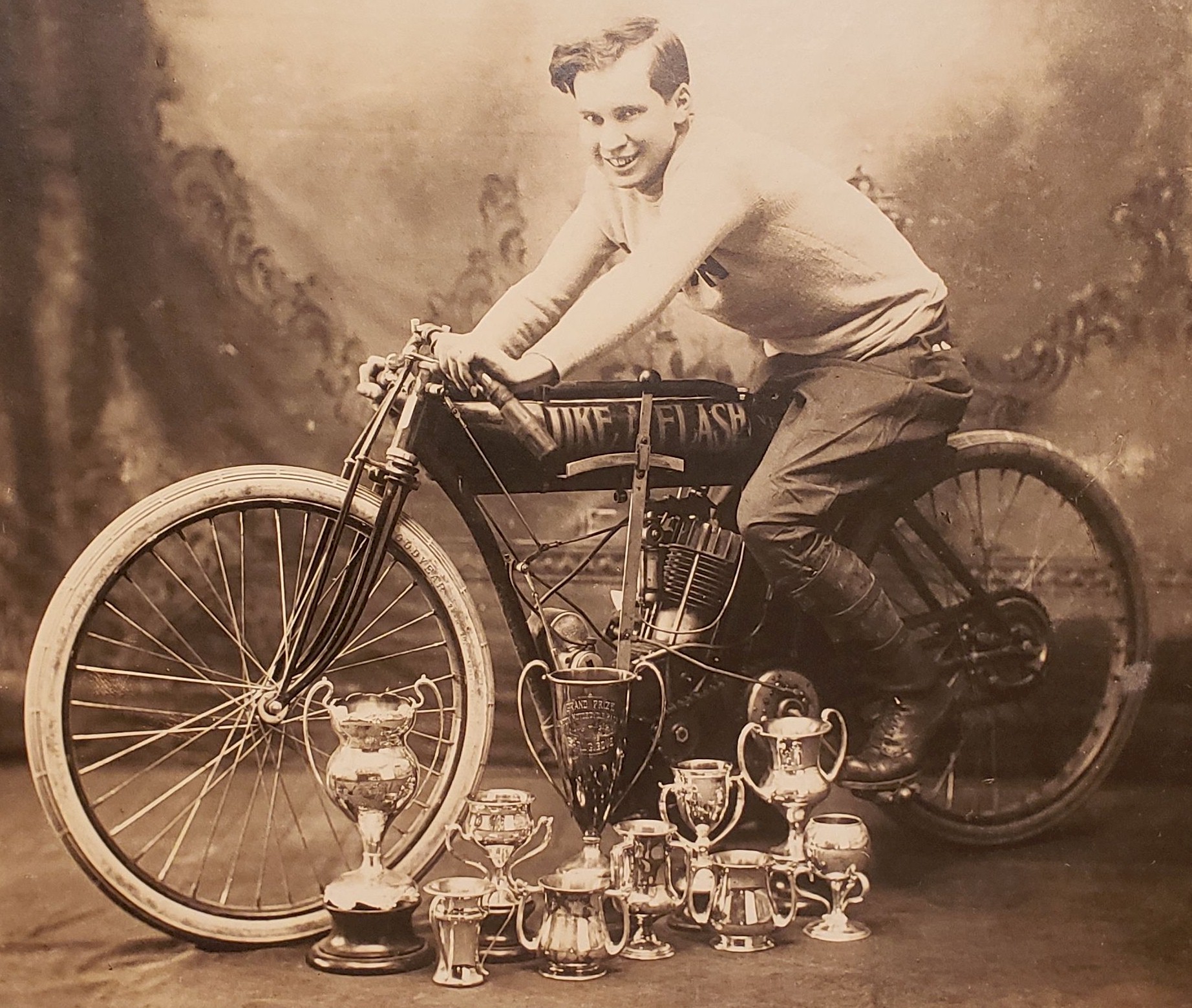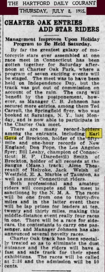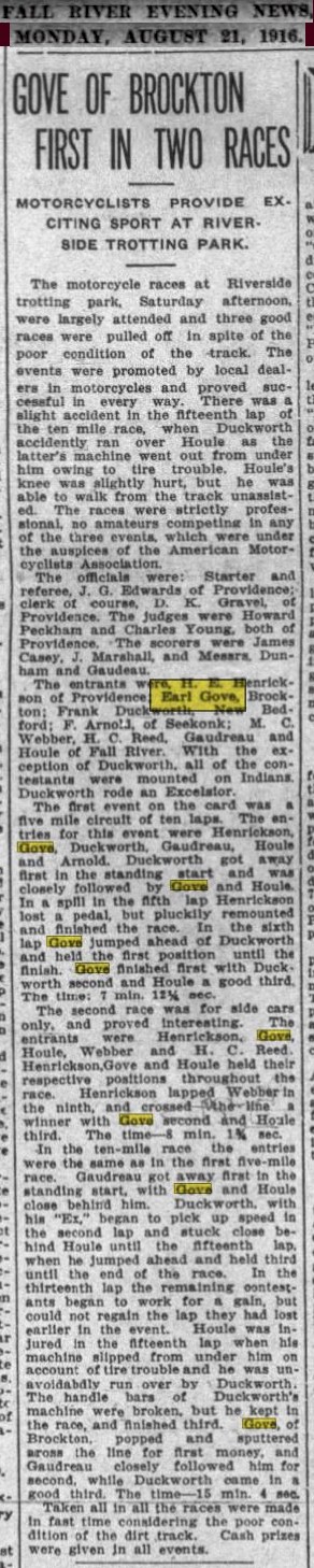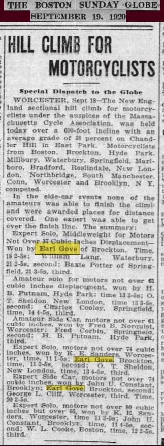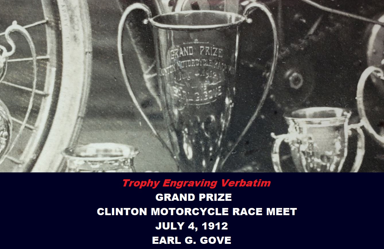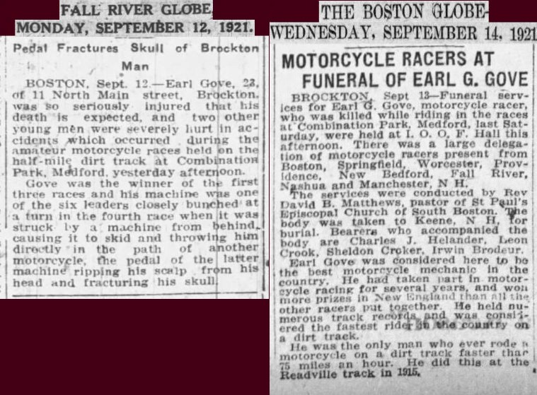 September 12th 1921 in a motorcycle race at Combination Park in the Boston suburb of Medford…I was able to I.D. him by enlarging the photo and reading the engraving on the center trophy…GRAND PRIZE - CLINTON MOTORCYLE RACE MEET – JULY 4TH 1912 – EARL G.