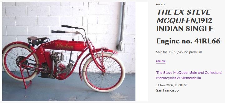 actor Steve McQueen also had a 1912 single cylinder Indian