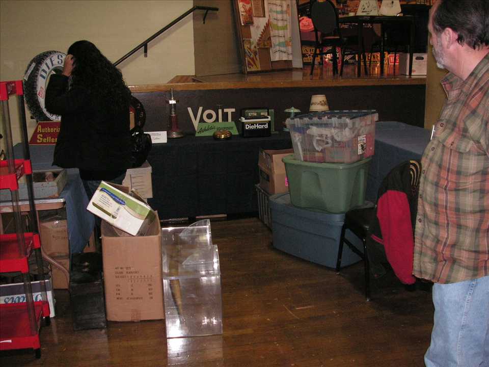 Next I spotted a very unusual 3-dimensional, Voit Athletic Equipment advertising sign/display. I've only seen one other example of this sign right there at the KarbergCaseVoit.jpg (85075 bytes) same show in August 2005. Mike Karberg of Blue Mirror Antiques out of Chicago had it and was asking $600.00 I think. When I first got it I wasn't sure about it. Now that I have it home though I'm wild about it! The way it's designed is very cool. The letters are...I don't know what you'd call it....deep I guess, very deep...made of all wood. AND it gets better....it's motorized.