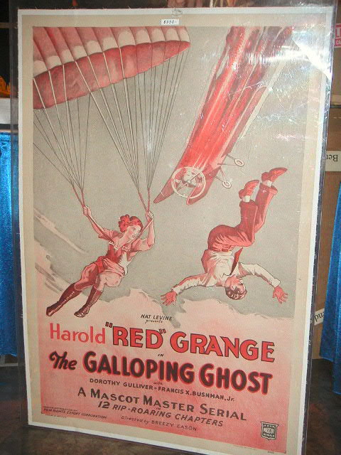 Cool sign, sold opening day. Next Galletta piece, a very nice one sheet movie poster with Red Grange starring in “The Galloping Ghost”, 27 3/8” wide by 40 ľ” tall, $950.00, fairly rare, classic must have for a Grange collector. Next, Galletta had a nice