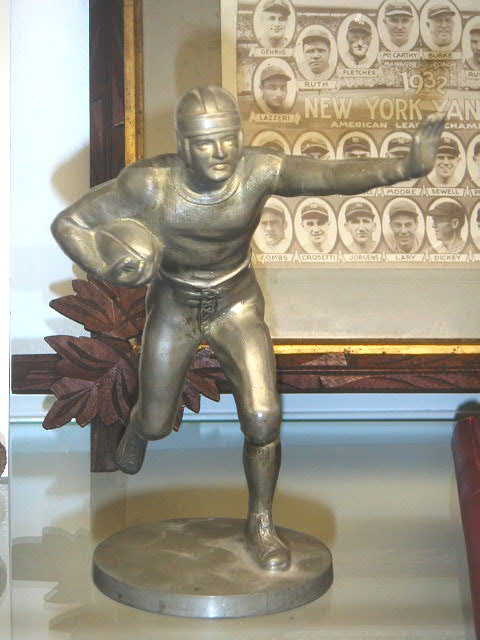 Football trophy figural of a ball carrier giving the stiff arm, made by Wallace, a major trophy producer, nice little piece, $295.00