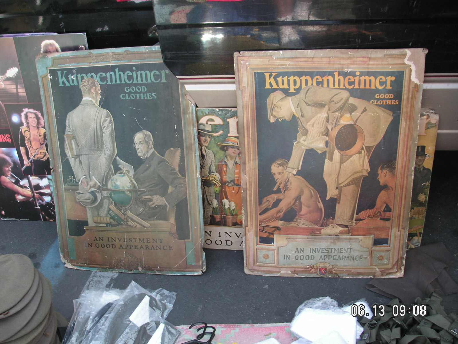 With three hours sleep and 2 1/2 hours walking it's hard to fully comprehend stuff....but I knew I scored and would take it in later....Before I could even get my bearings about two minutes walking later I see two scruffy ravaged easel back advertising signs for Kuppenheimer Clothiers illustrated by Joseph